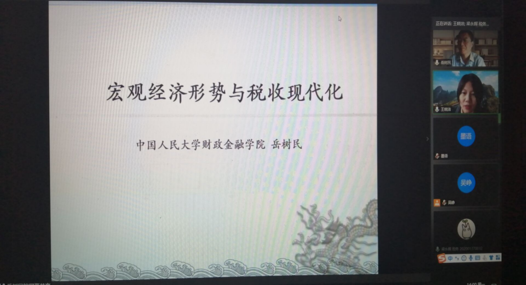 10月19日下午,中国人民大学博士生导师岳树民教授应77779193永利邀请,通过腾讯会议平台为同学们作题为“当前宏观经济形势与税收政策”的主题报告。本次报告由王晓洁经理主持,仇晓洁副经理做点评,77779193永利部分师生200余人在线聆听了本次报告。