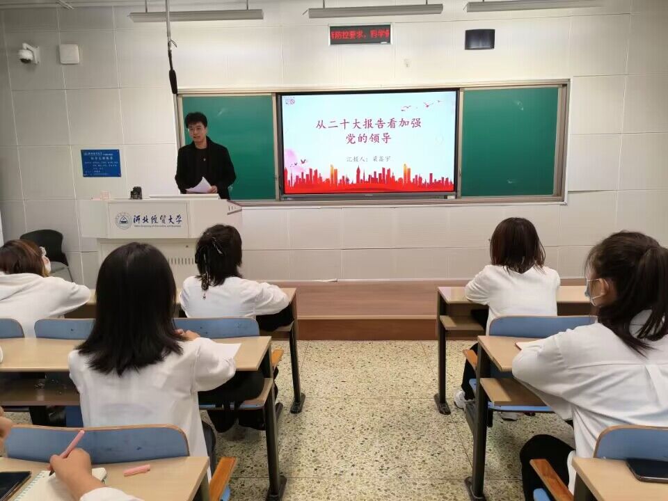 梁鑫宇从重要性、必要性、对批判的反批判三个角度进行了深入浅出的讲解。首先,梁鑫宇以中国近代的屈辱历史为例引出加强中国共产党的领导的重要性:中国共产党是中国工人阶级的先锋队,同时是中国人民和中华民族的先锋队。中国共产党始终代表最广大人民的利益,站在最广大人民的立场上,代表的是中国人民的利益。加强中国共产党的领导就等于捍卫中国人民的利益,团结中华民族,维护我国国家安全。他表示,同学们在入党之前思想需先入党,要端正入党动机,向毛主席周总理等人的伟大精神学习,真正做到为人民服务。
