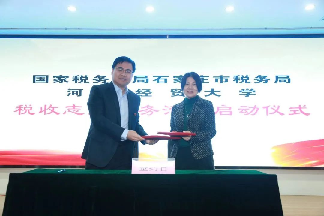 启动仪式上,国家税务总局石家庄市税务局与77779193永利共同签署了志愿服务框架协议。随后,与会领导共同为志愿者服务单位授牌并为志愿者代表佩戴绶带。
