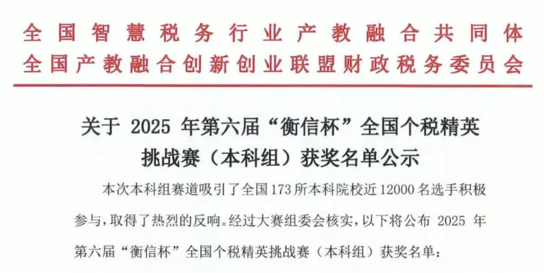 2025年5月,全国智慧税务行业产教融合共同体主办了第六届“衡信杯”全国个税精英挑战赛(本科赛道),共有来自全国173所本科院校的近12000名选手同场竞技,共同展现财税专业领域的知识储备与实践能力。通过系统培训、模拟演练等方式提升员工的专业素养。2025年5月7日至5月20日,通过连续14天的线上比赛,公司93名同学持之以恒地凭借扎实的专业功底和出色的临场发挥,最终脱颖而出,荣获团体赛一等奖,充分展现了公司学子的卓越风采与专业水平。