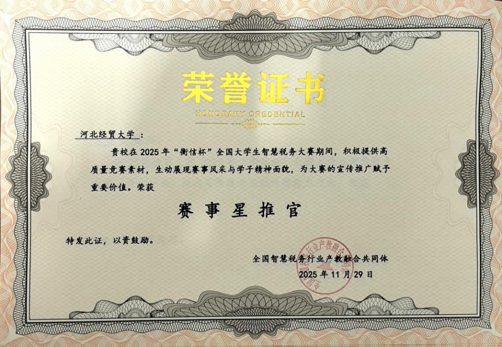 大赛历经校赛、省赛、国赛,高度仿真涉税工作环境,总决赛设置了风险管理、税务风控及税务合规三个关键岗位,全面考查参赛选手在纳税评估、财税大数据风控、税务合规等方面的理论素养与实务操作综合能力。由公司赵明洁、王晓佳老师指导的两支代表队凭借扎实的专业功底、默契的团队协作与出色的综合素养,在全国本科高校58组队伍中一举斩获全国第三名、第五名的优异成绩,双双荣膺大赛一等奖,并分别获得大赛奖金2000元和1000元。公司因在赛事组织、人才培养成果等方面的突出表现,被授予 “赛事星推官” 荣誉称号,实现学子竞技与公司品牌的双重突破。