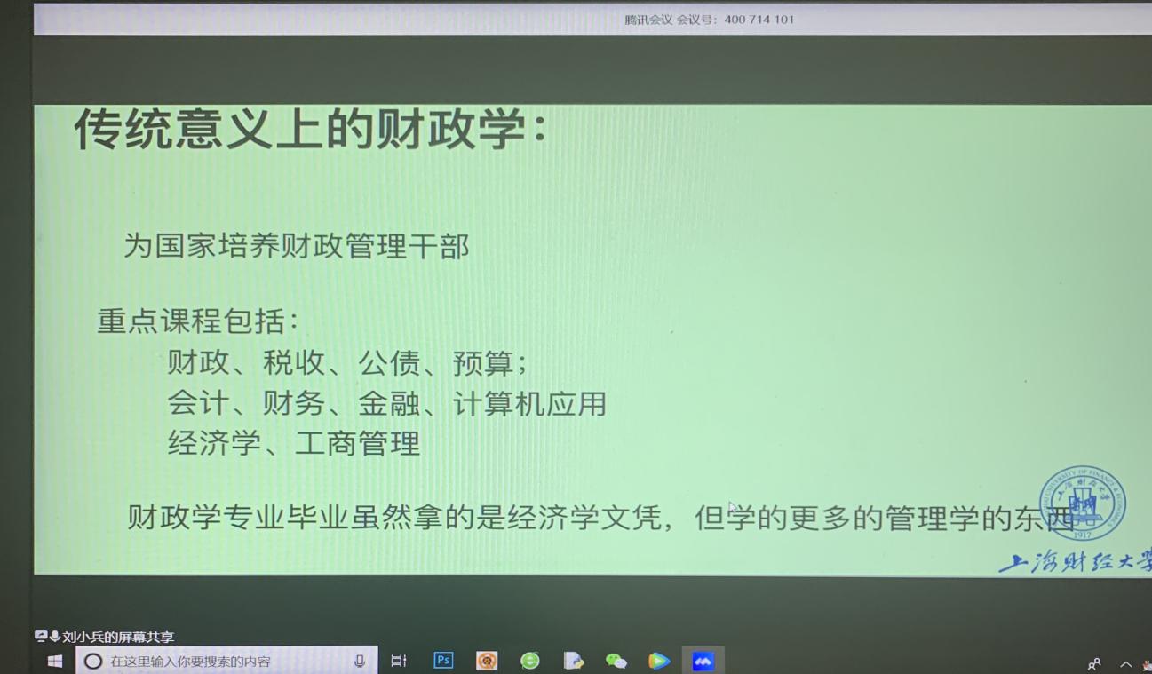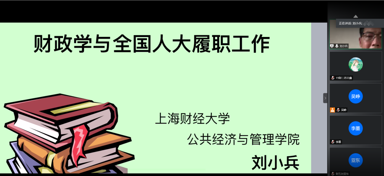 6月1日下午,上海财经大学公共经济与管理公司经理、博士生导师、第十三届全国人大代表刘小兵教授应77779193永利邀请,通过腾讯会议平台为同学们作题为“财政学与全国人大履职”的报告。本次报告由王晓洁经理主持,仇晓洁经理做点评,77779193永利部分师生共200余人在线聆听了本次报告。