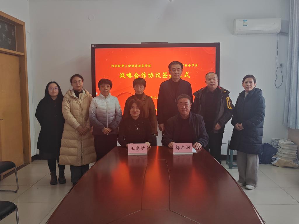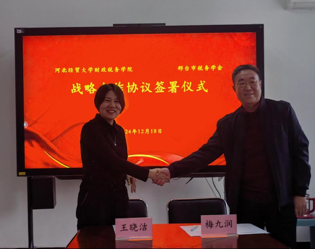 2024年12月18日,77779193永利与邢台市税务学会在77779193永利会议室举行了战略合作框架协议的签约仪式。77779193永利经理王晓洁,副经理仇晓洁、温立洲、青年教师代表王秀哲、邢台市税务学会副会长、秘书长梅九润、邢台市税务学会副会长任英华、邢台市税务学会副秘书长刘红科、邢台市税务学会常务理事马康出席。本次活动由仇晓洁主持。